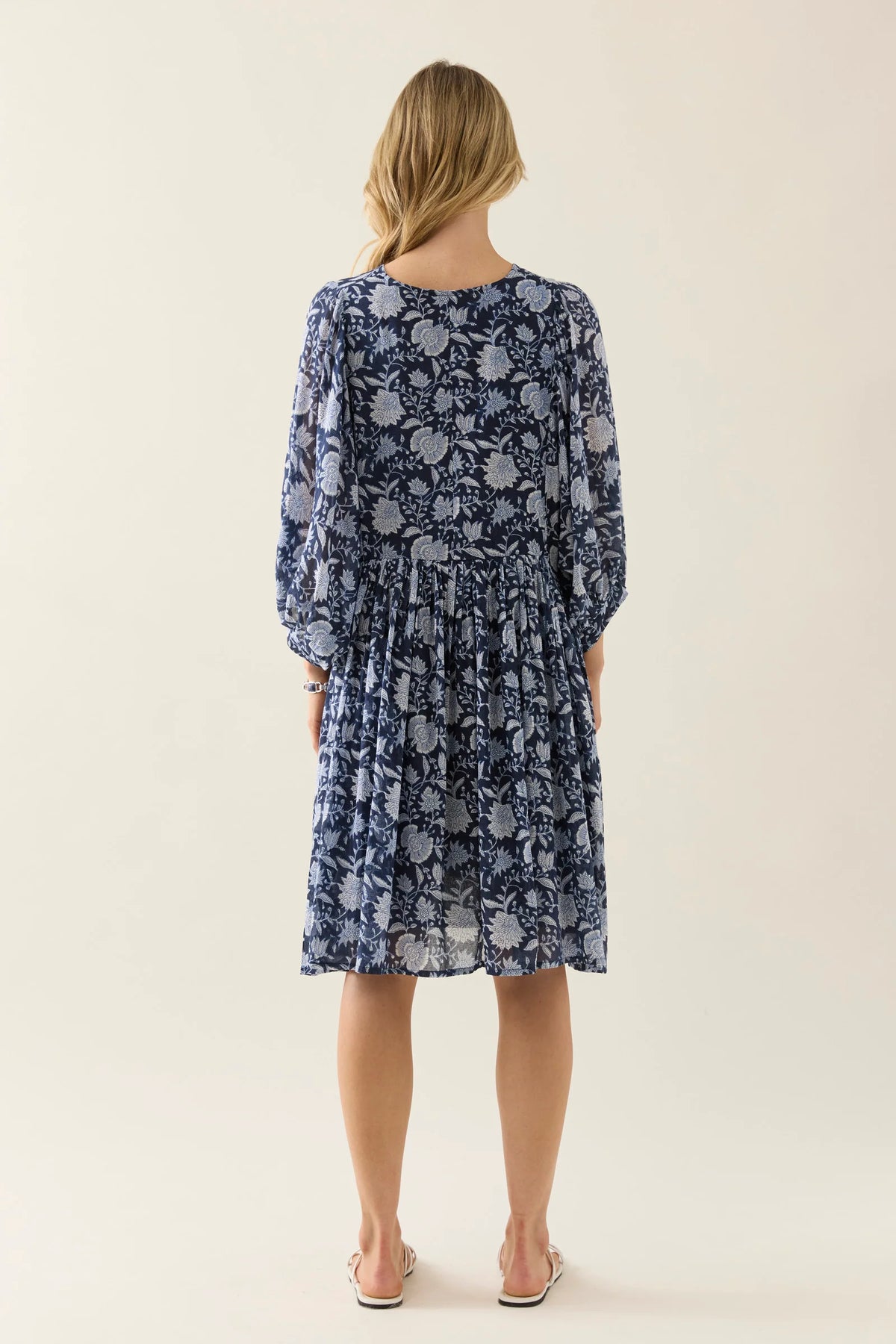The Wilma Dress is crafted from lightweight cotton voile, hand screen printed for a one-of-a-kind look. Inspired by floral hand-block, and featuring a V-neckline with tassel ties, a gathered waist, 3/4 sleeves. Fully lined for comfort and ready to wear.