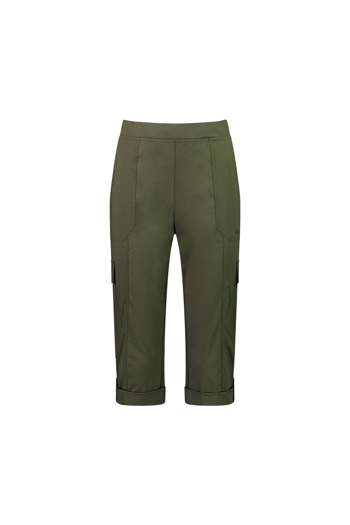 • Made from stretch fabric for the perfect fit • Elastic waistband • Two front cutaway patch pockets with 'Vassalli' embroidery on left-hand side pocket and metal 'V' logo rivets • Two side cargo pockets with flaps • Two back patch pockets • Panel seams • Side button tabs to wear pants cuffed or uncuffed • Model wears size 10