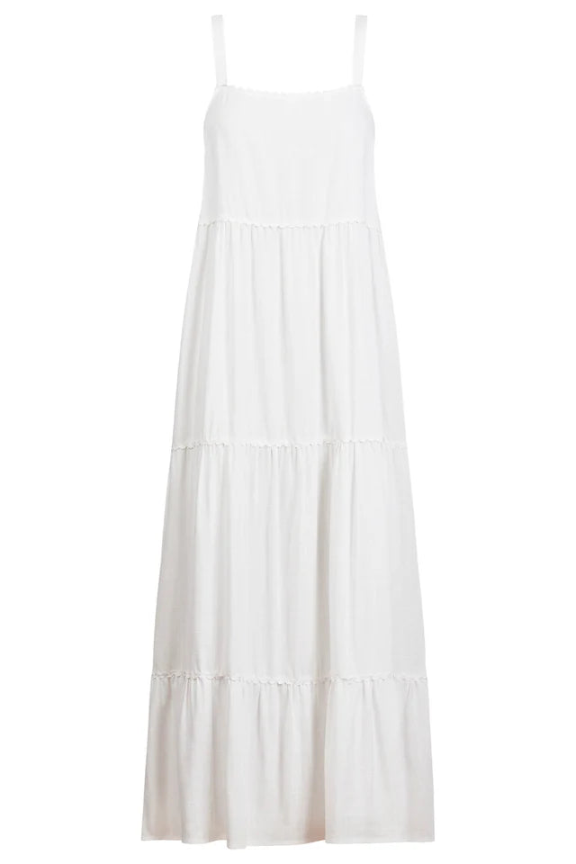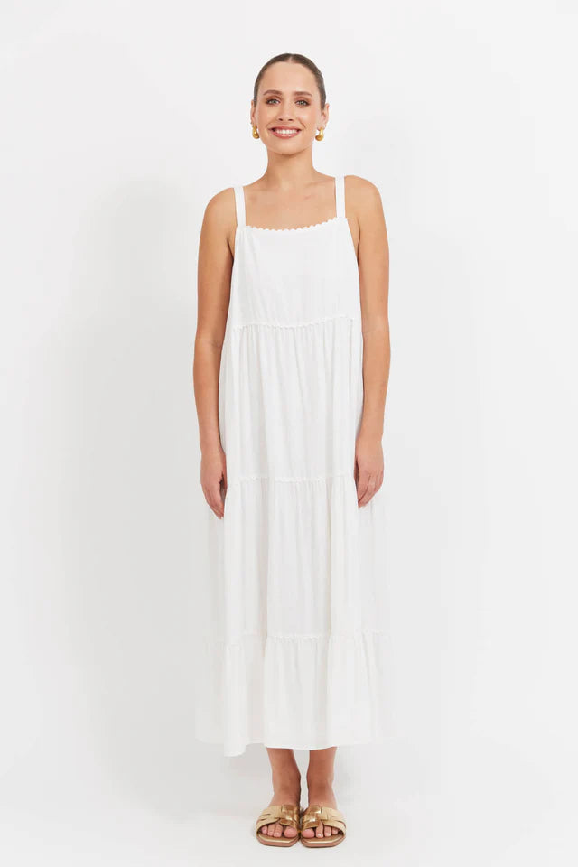 Your no-fuss, go-everywhere summer hero. The Haiti Tank Maxi Dress is tiered, flowing, and versatile - from beach strolls to balmy nights out. Featuring a straight neckline, adjustable straps with gold-tone hardware, and an elasticated back panel for comfort. Ric-rac trim along the neckline and skirt tiers adds playful charm, while internal side pockets keep things practical.