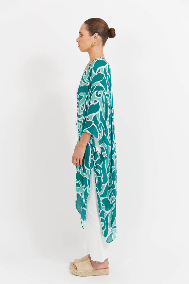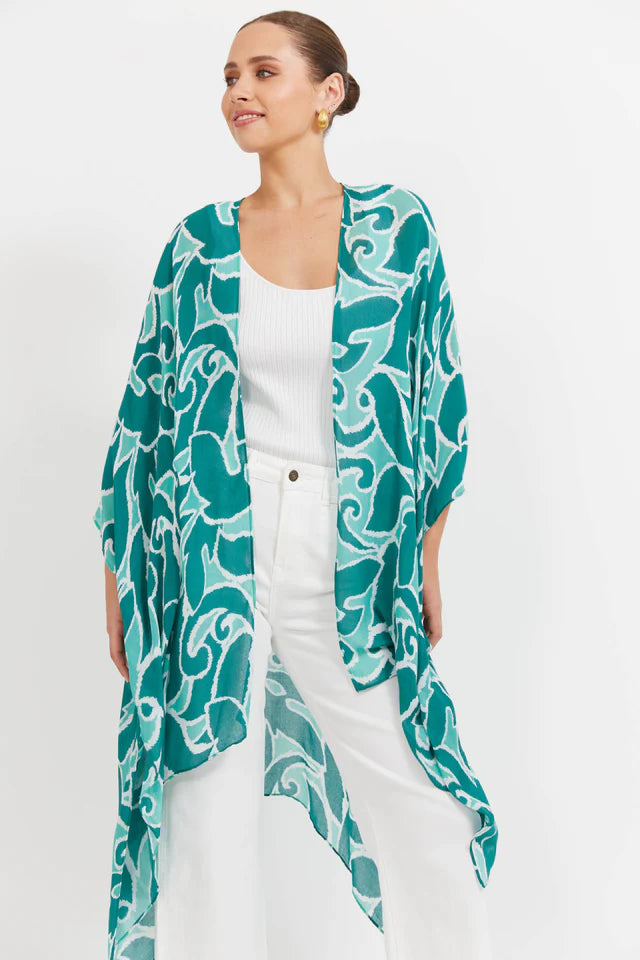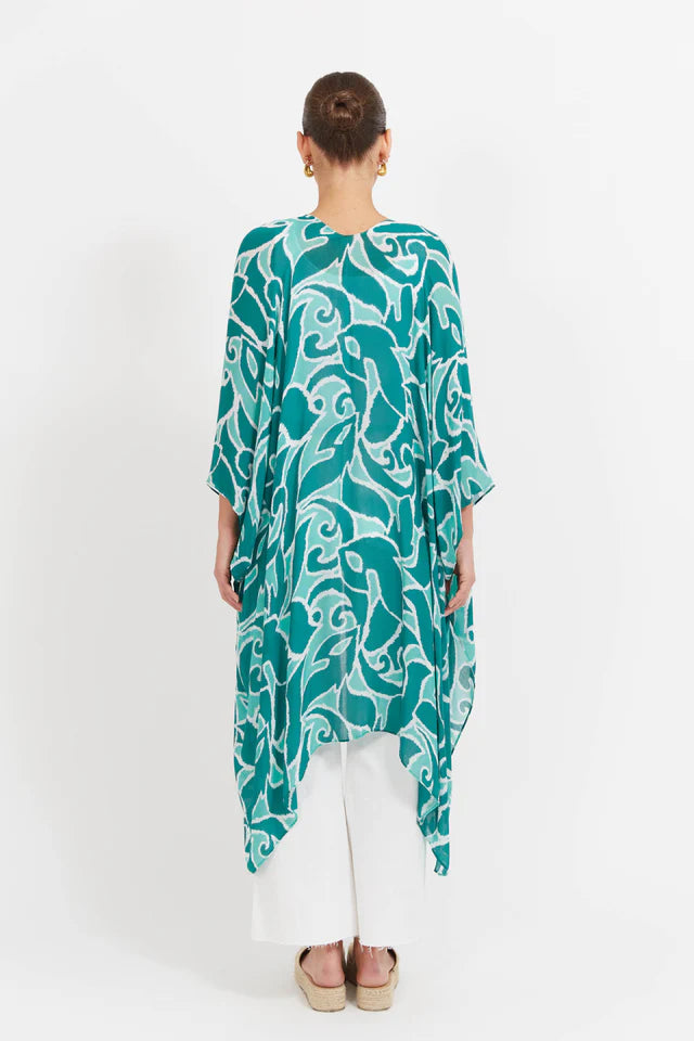 A light layer with a bold touch. The Bahama Cape is your go-to for easy sun coverage - whether thrown over swimwear or styled with everyday pieces. Featuring an open-front design, 3/4 length sleeves, side vents, and a flowing handkerchief hem, it adds movement without the bulk. Crafted in a semi-sheer, summer-ready print, it pairs perfectly with the matching Bahama Swimsuits for a coordinated beach-to-lunch look.