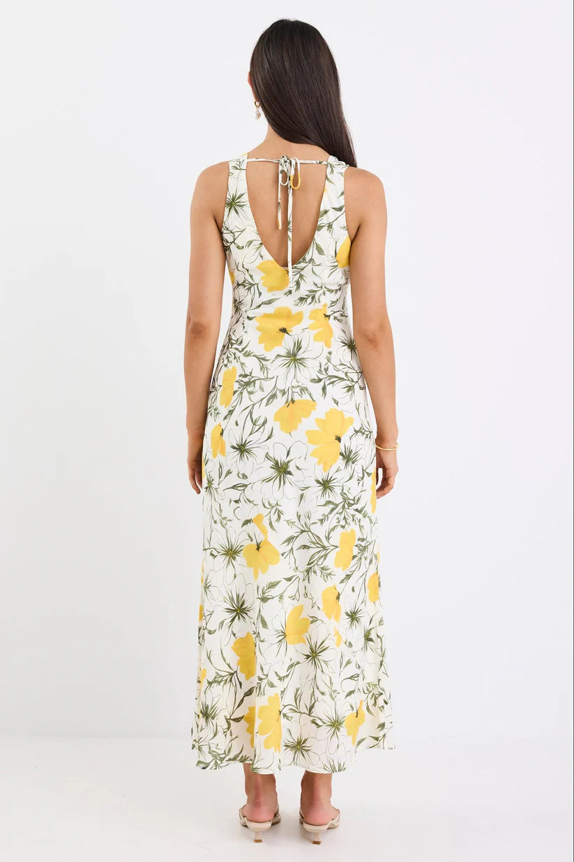 This dress features a bold and vibrant buttercup floral print, crafted from a soft and breathable polyester fabric. The sleeveless design and flattering V-back offer a chic, feminine silhouette, while the bias cut enhances your figure with a relaxed, elegant fit. Fully lined for comfort, this dress combines effortless style and all-day wearability, perfect for garden parties, brunches, or casual evening outings.