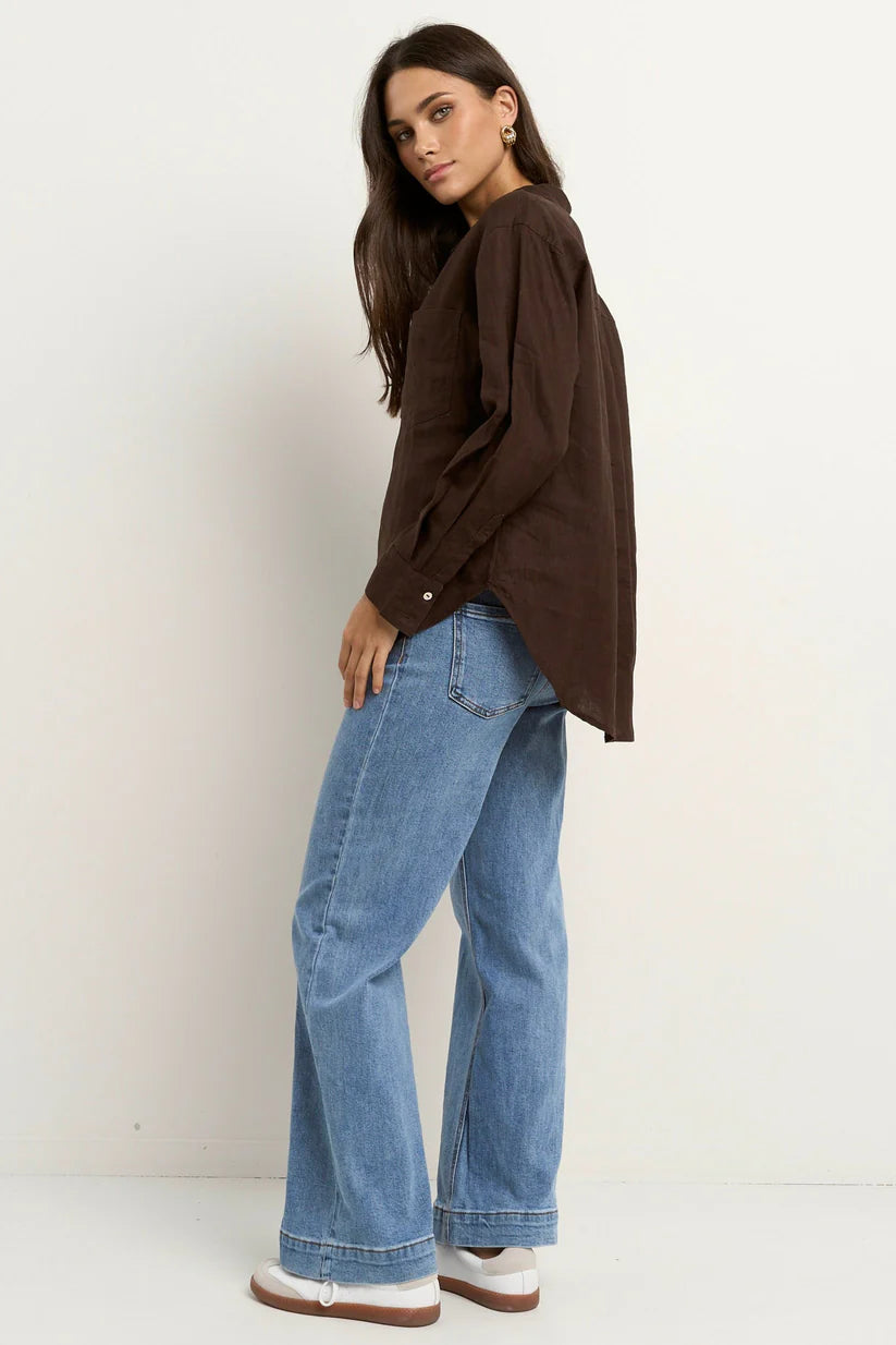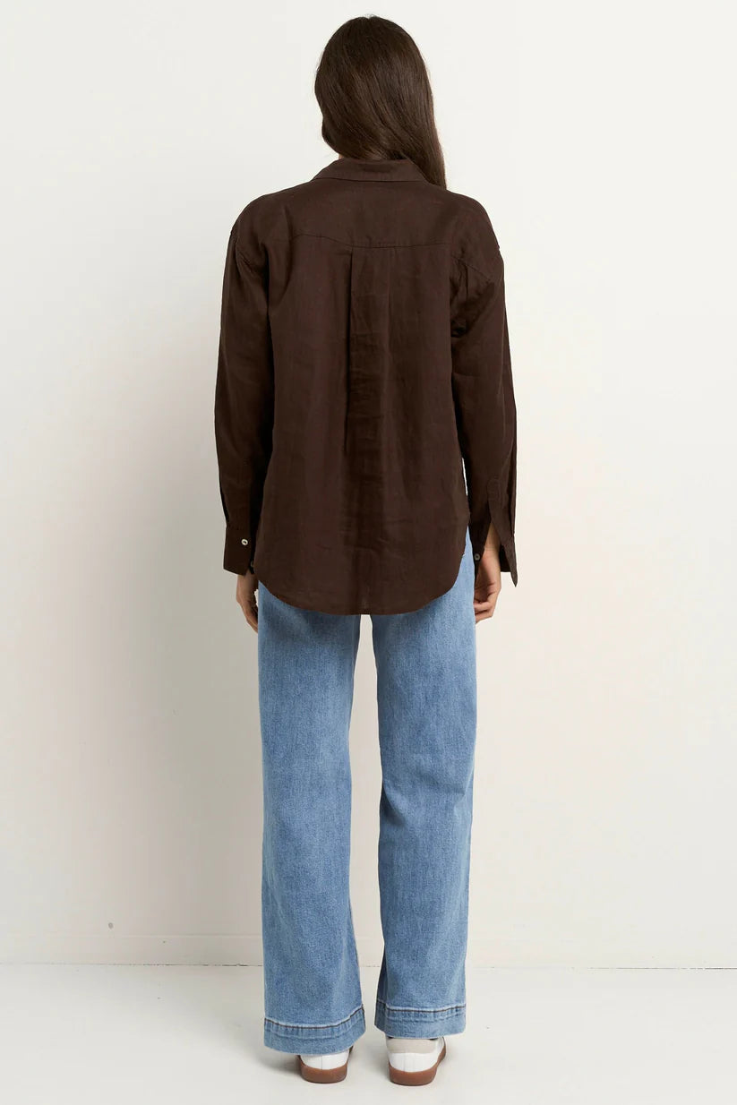 - 100% linen in a rich, chocolate hue - Oversized fit with a casual, draped feel - Button-down front and chest pocket detail - Natural fibre, breathable and trans-seasonal - Soft garment wash for a relaxed, premium finish - Natural Fibre