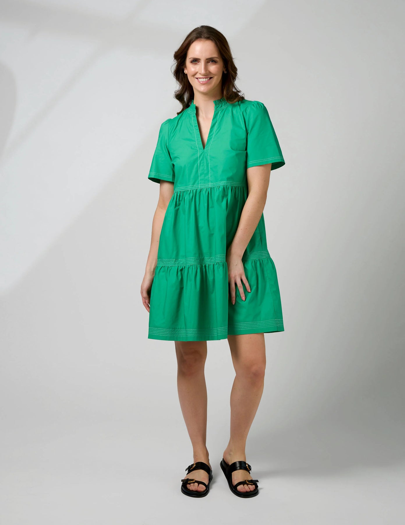 Elevate your everyday style with the Stella + Gemma Willa Dress in rich emerald. This knee-length beauty features a flattering V-neckline adorned with delicate ruffle trim, while contrast stitching adds a cheeky design detail that catches the eye. The tiered silhouette creates movement and dimension, making it perfect for everything from casual outings to weekend adventures. Versatile, fun, and undeniably charming—your new wardrobe favourite awaits.