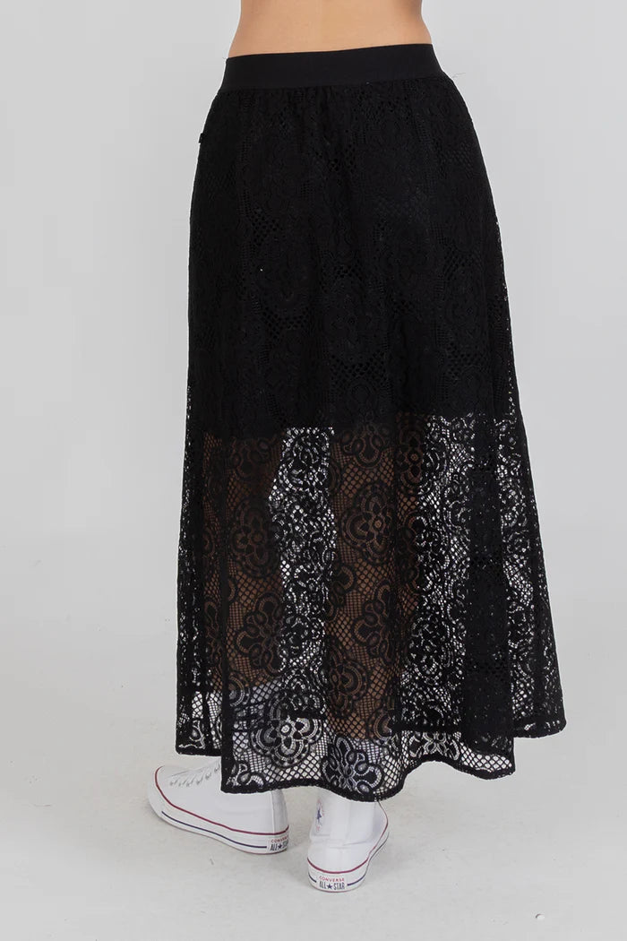 Elevate your wardrobe with the Lace It Skirt, featuring a delicate black lace overlay adorned with an exquisite floral print. This sophisticated piece effortlessly blends elegance and grace, perfect for both formal occasions and refined everyday wear. The flowing silhouette enhances your natural movement, creating a timeless and flattering look.