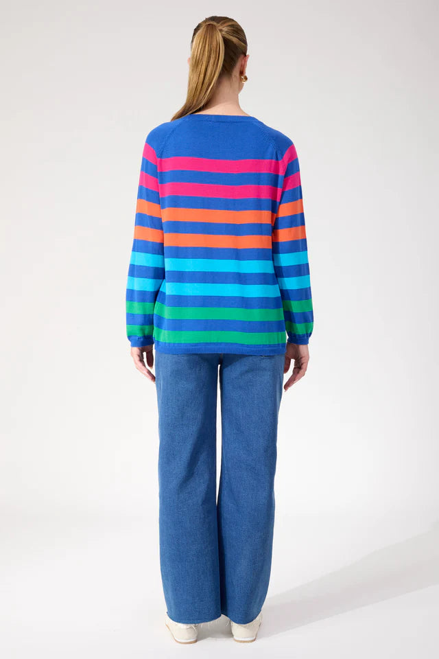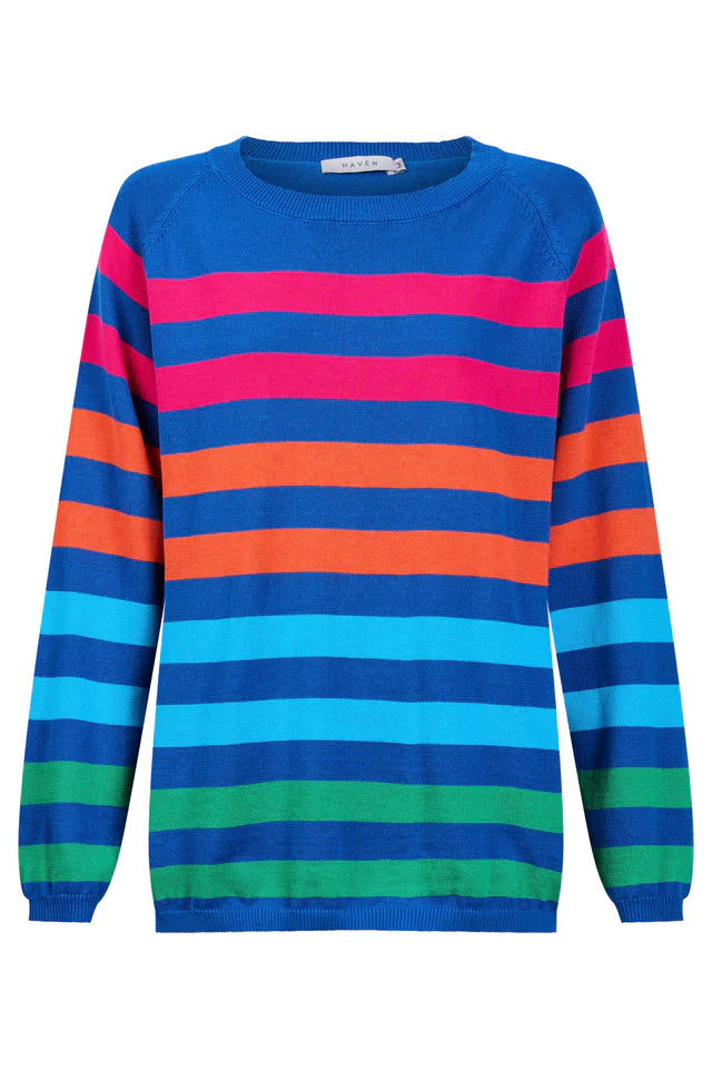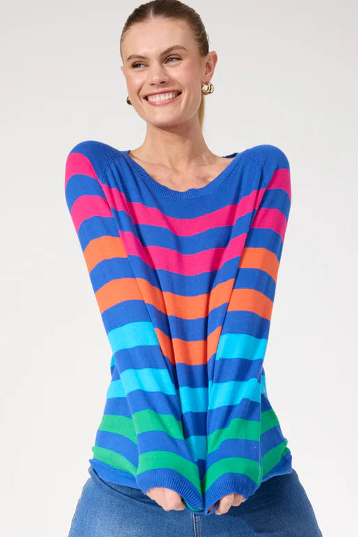 A cosy statement knit designed with comfort at its core. The Valenza Jumper features a custom degrade stripe design that blends soft pastels into warmer tones, creating a relaxed, Nordic-inspired colour story. The textured knit adds depth, while oversized balloon sleeves and drop shoulders give it that effortless, après-ski feel.