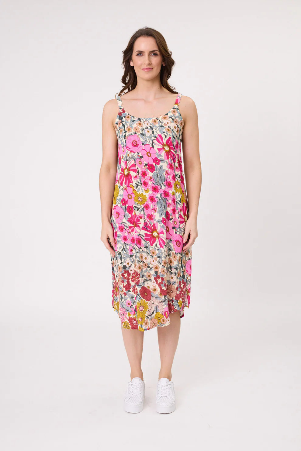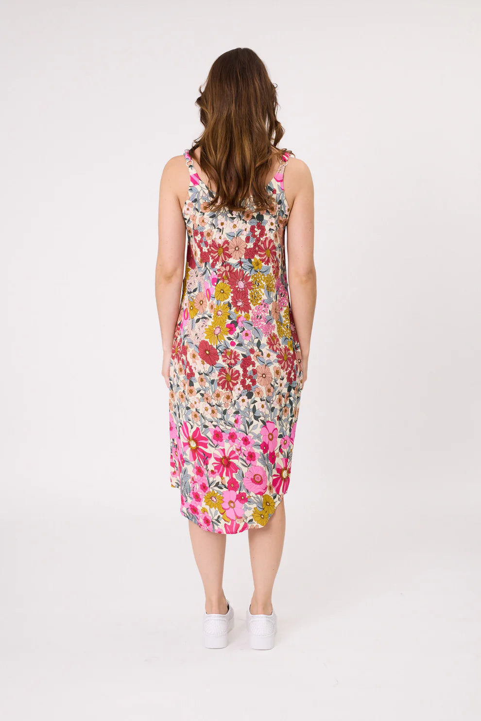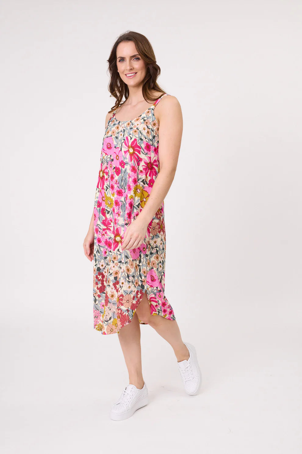 Let your wardrobe bloom this season. The Bloom Midi Dress is a statement in colour and confidence, featuring a bold floral print in vivid shades of blue, green, purple, and fuchsia. Its soft frill sleeve adds a feminine touch, while the easy midi length flatters your shape without clinging.