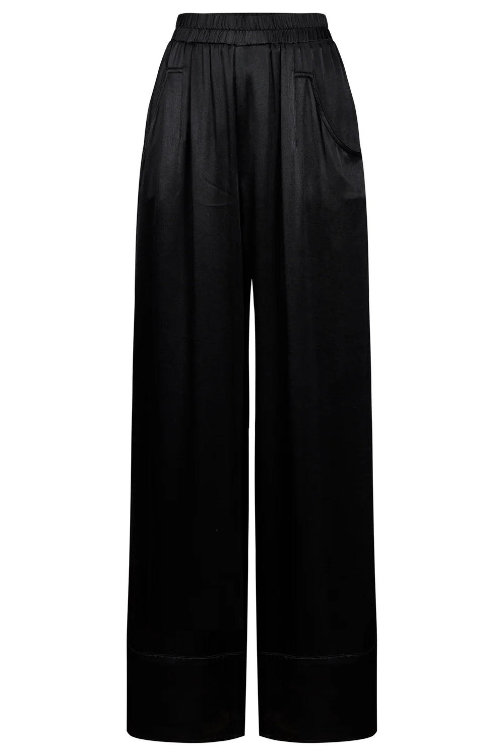 A refined winter-weight pant crafted from a softly draped fabrication with subtle sheen. Featuring an elasticated waist, wide straight leg, wide hem detail and pockets. A polished, comfortable style ideal for everyday wear.