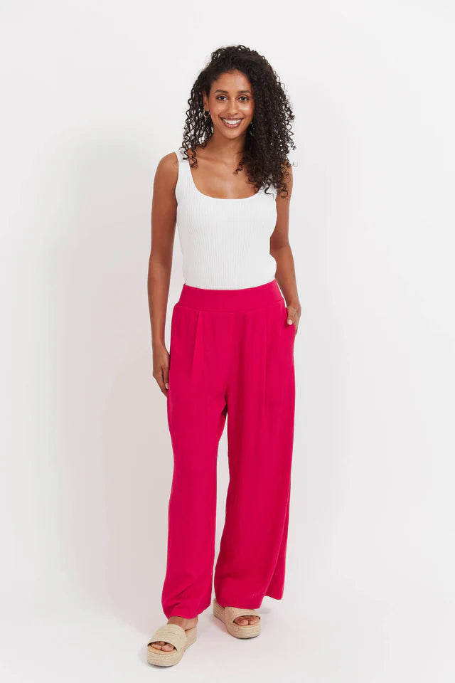 The Jardin Pant is crafted from a breathable linen blend and features a relaxed leg with soft front pleats for a flattering drape. A flat front waistband keeps the look clean, while the elasticated back ensures comfort throughout the day. Designed to sit full length or 7/8 on taller heights, it's a timeless, wear-anywhere style with a relaxed fit and practical side pockets.