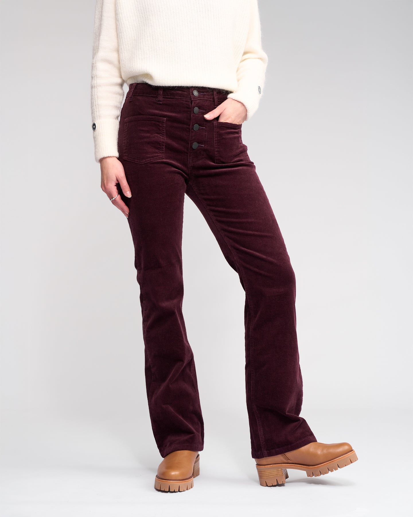 • Bootcut full length pant • Made from stretch wide wale cord fabric • Metal 'KNEWE' logo jean four-button fly • Waistband features 4 front beltloops and 3 back beltloops • Front patch pockets • Back patch pockets with seam detail • Leather 'KNEWE' brand patch on wearers back right-hand side waistband • Model is 175cm tall, wears size 10