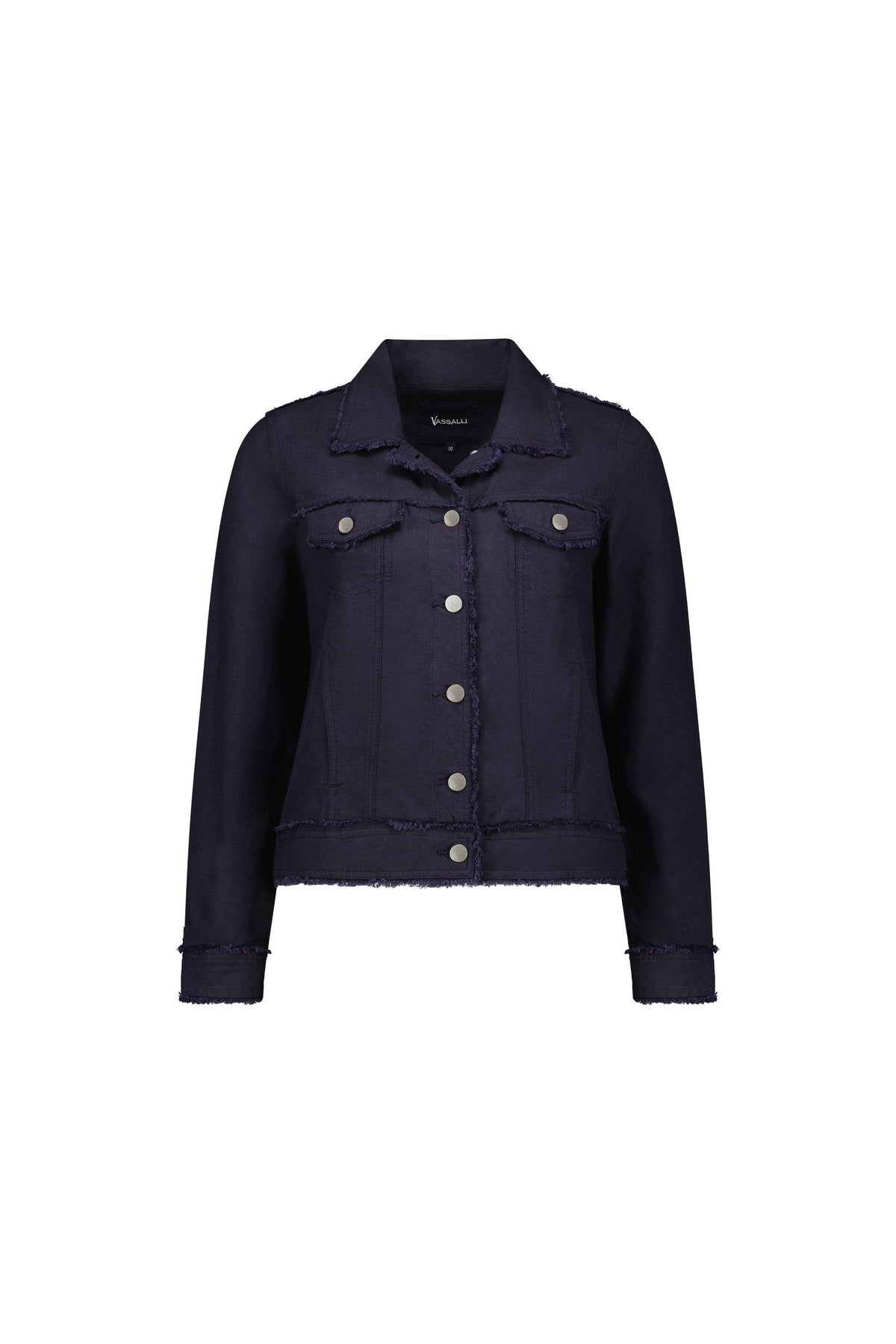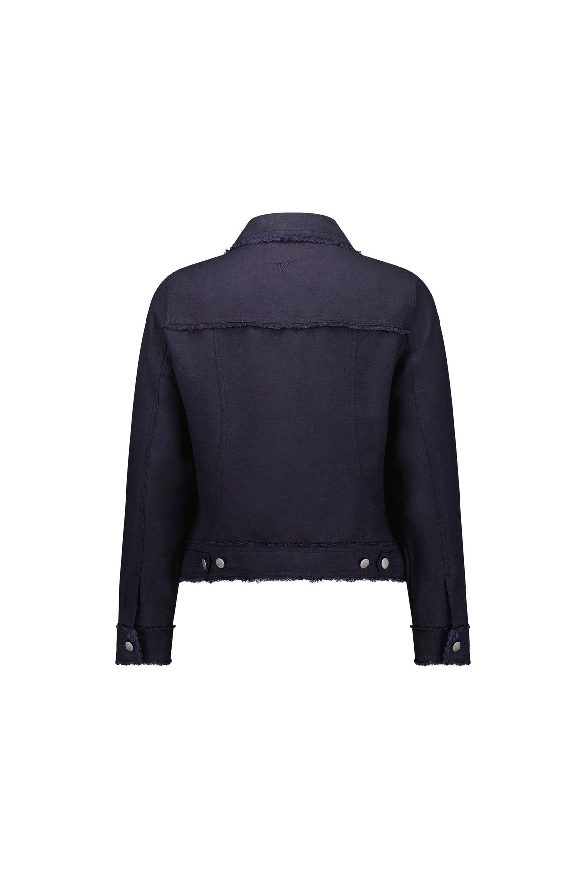 • Classic denim jacket shape with frayed seam details • Button up front with metal 'V' logo jean buttons • Two chest pockets with flap and jean button fastening • Panelled sleeve with cuff, placket and jean button fastening • Adjustable button tabs on back waist hem • 'V' embroidery at centre back neck • Relaxed fit • Model wears size 10